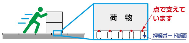 荷物を"点"で支えているので、接する面積が極めて小さく摩擦抵抗力が低いため、少ない始動力で荷物を押し引きすることができます。